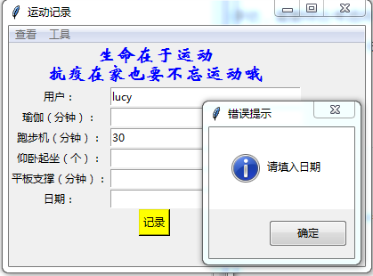 (2) 多处使用showinfo语句提示用户记录成功、注册成功。当用户未输入姓名就注册的情况下会及时提醒用户。当用户未注册就记录,提示先注册。当用户在空格中填入文字时,提示只能填入文字。当用户重复注册,提示已注册。当用户未填日期就记录时,提示填入日期。